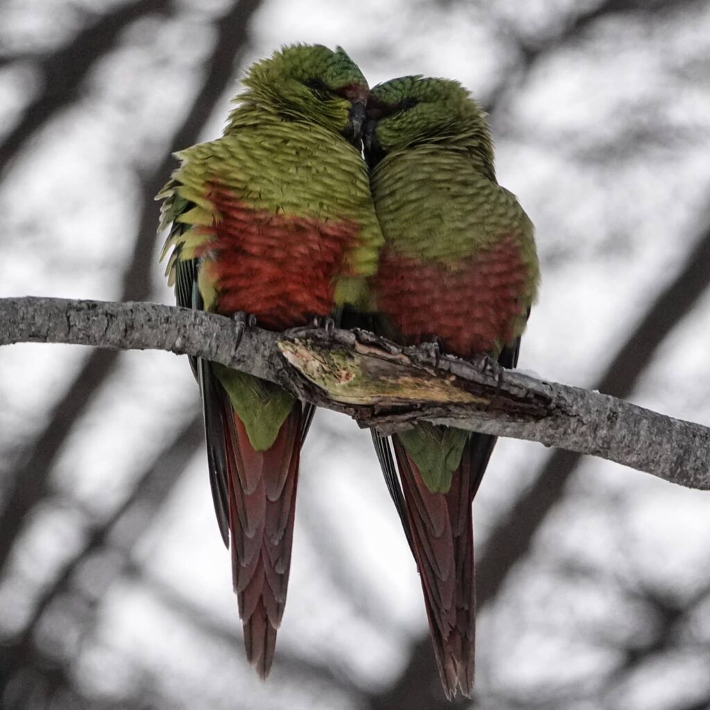 A long-tailed green conure, the Austral Parakeet is the southernmost parrot in the Americas. Social, vocal, and often conspicuous, it forms flocks that may exceed 100 individuals, especially outside the breeding season.