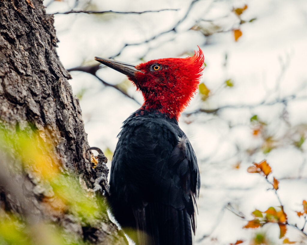 The Magellanic Woodpecker is the largest woodpecker in South America and one of the most emblematic birds of the austral temperate forests of Chile and Argentina. Entirely dependent on mature Nothofagus-dominated forests, it is unmistakable for its bold black-and-white plumage and striking sexual dimorphism: males with a solid red head and straight crest, females with a black face and distinctive curled crest with red at the base of the bill.